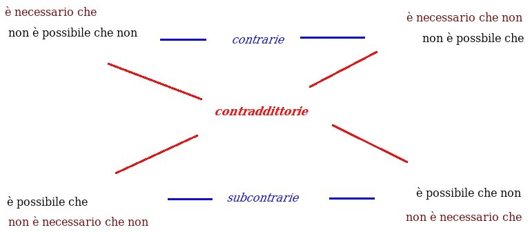 Tutto parte dalla definizione di possibilità: impossibile è ciò che non può essere o accadere; necessario ciò che non può non essere o accadere; contingente è ciò che c'è o accade, ma potrebbe non esserci o non accadere; possibile è ciò che non c'è o non accade, ma può esserci o accadere. Quest'ultima definizione è scorretta, perché contiene ciò che deve definire. Se prendiamo però come primitivo il possibile, possiamo costruire il noto quadrato logico: