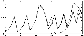 Il grafico che segue mostra come per tre periodi c'è una sola curva; al terzo periodo, la linea si sdoppia (tratto continuo e tratteggio). Le due linee sembrano proseguire allo stesso modo per un poco, poi diventano completamente diverse. I valori delle due linee partono da valori che sono diversi per 1/1000. C'è un'altra linea, verso la fine della curva. Quella sottile parte da un valore iniziale diverso per 1/1000.000. Questo mostra l'importanza delle condizioni iniziali. La funzione modulo (1) è essenziale per creare questa differenza.