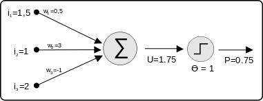 La cosa importante è il peso: nella connessione, cioè nella sinapsi, si può definire un “peso”, da 0 a 1, che è l'efficienza di trasmissione del segnale in ingresso. Questi pesi vanno moltiplicati per i rispettivi segnali, il tutto viene integrato dal corpo del neurone tramite una sommatoria, dopo di che c'è l'uscita (U=1,75). Poiché la soglia è uguale a 1, quello che viene propagato è l'eccesso (0,75). Questo segnale non è 0 o 1, ma posso considerarlo non digitale in senso stretto.